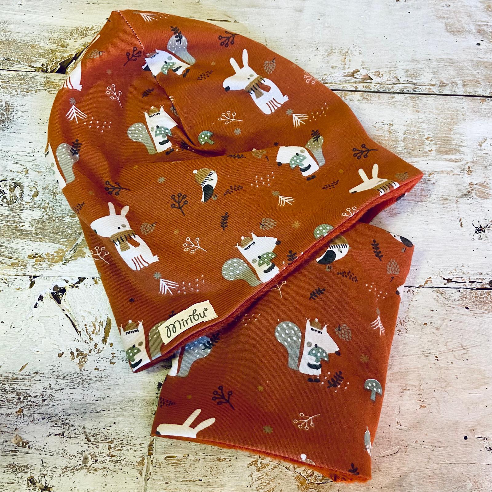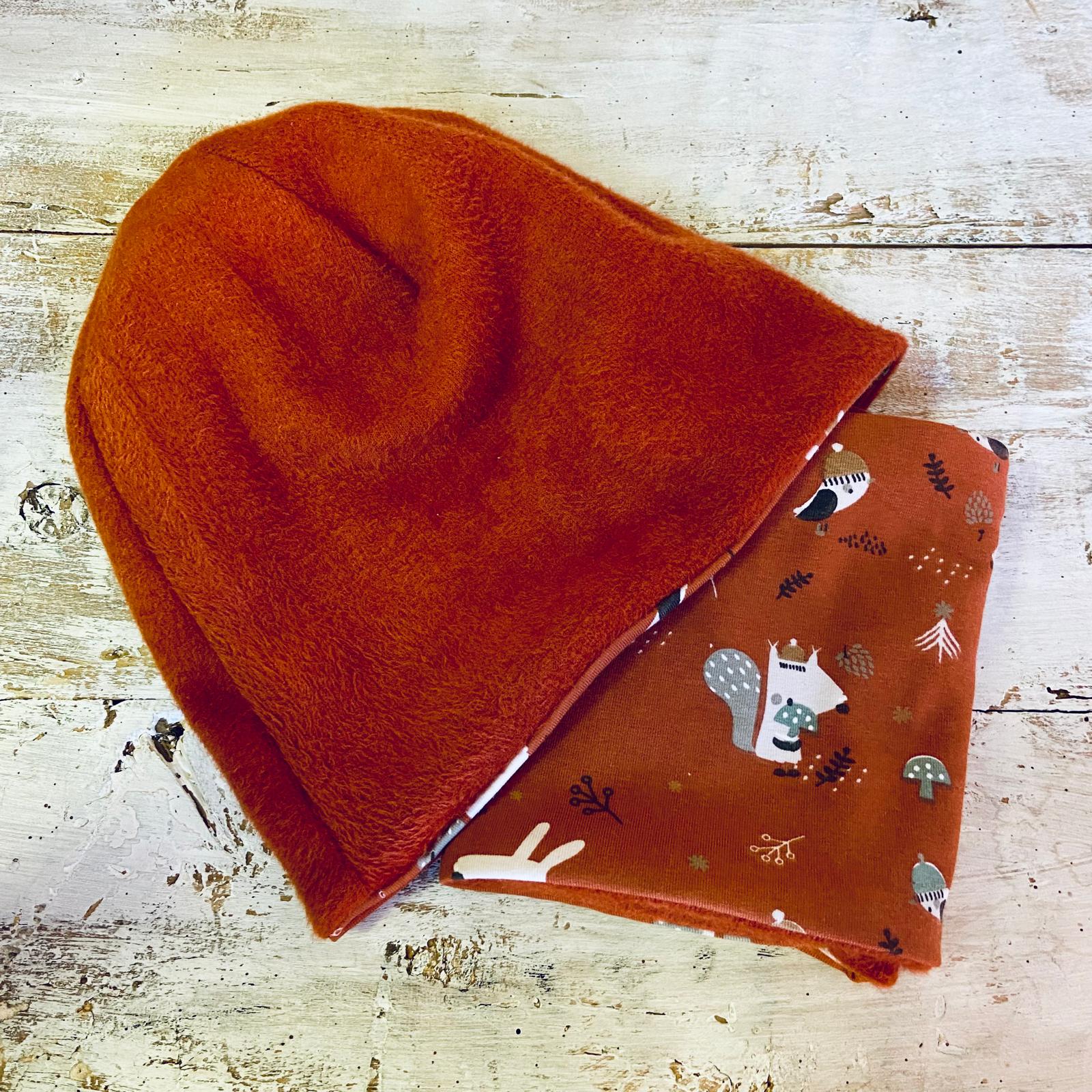 Coordinato cuffia e scaldacollo Autunno nel bosco – Taglia L (Versione in morbido Pile)