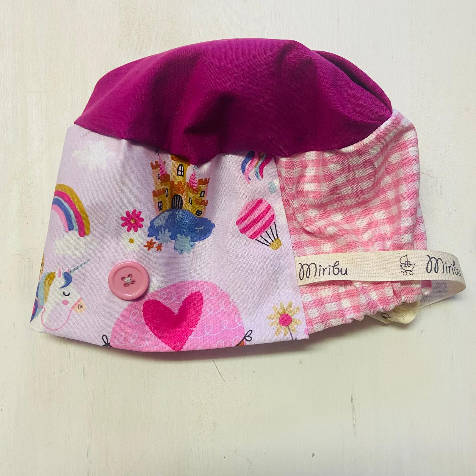 3 cuffie in fantasia coordinata, realizzate a mano 100% cotone. Elastico sul retro con laccetti di cotone per la chiusura.