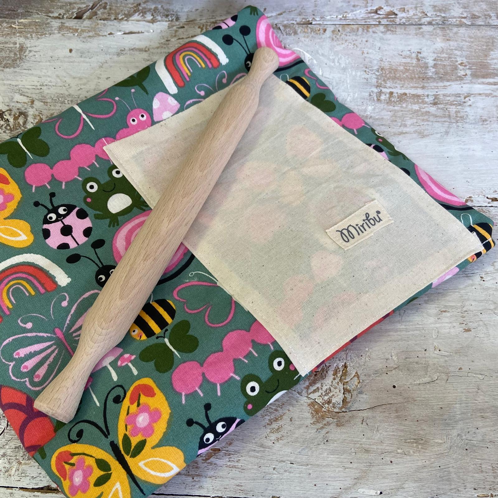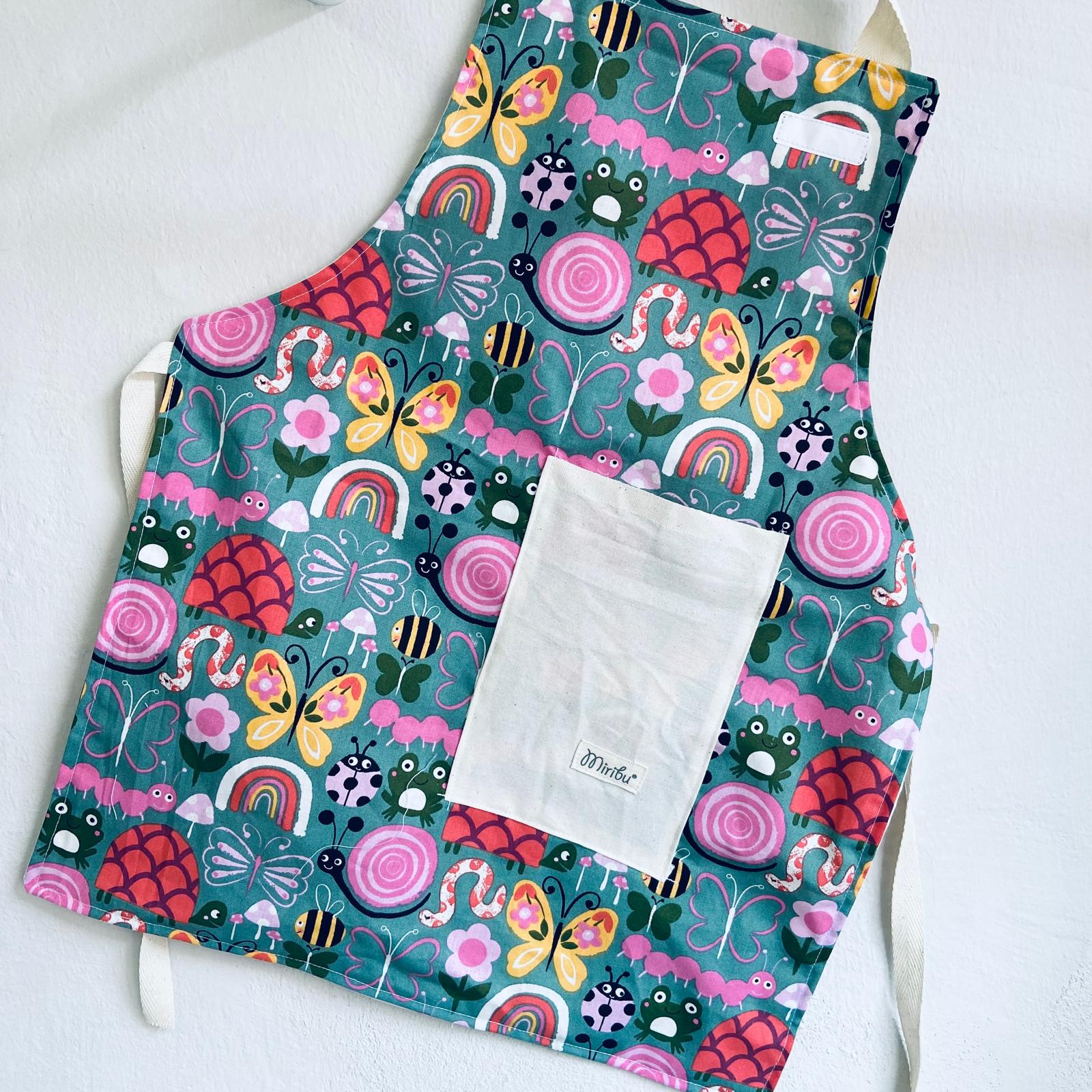 Il grembiulino da cucina è regolabile al collo con strappo in velcro e in vita con nastro in cotone.