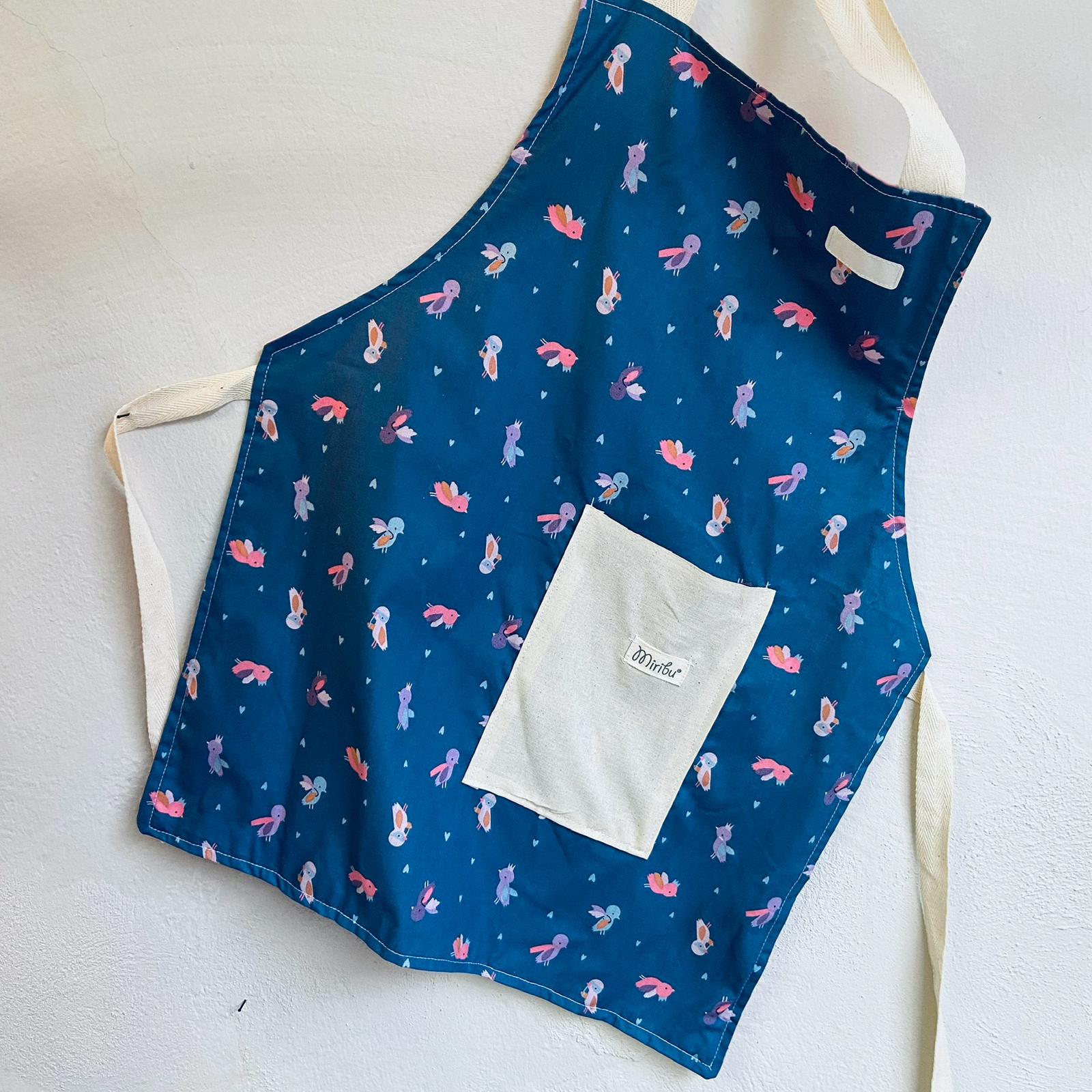 Il grembiulino da cucina è regolabile al collo con strappo in velcro e in vita con nastro in cotone.