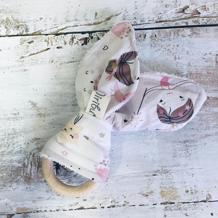 Questo lo rende ideale nella fase di dentizione e assicura la massima igiene, la stoffa è lavabile in lavatrice e l’anello di legno a mano.