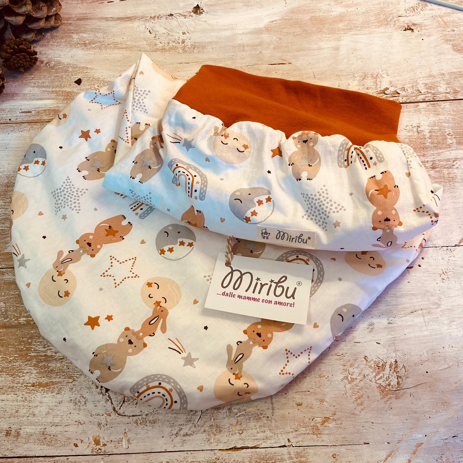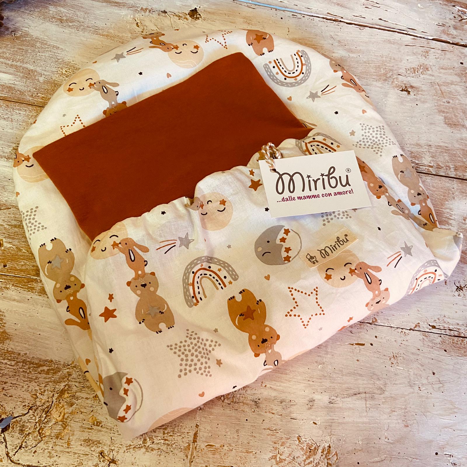 Nel sacco coccolone, il neonato può sgambettare liberamente a gambine nude, sperimentando i confini del sacco che ricordano, in dimensioni e forma, la pancia della mamma rassicurandolo.